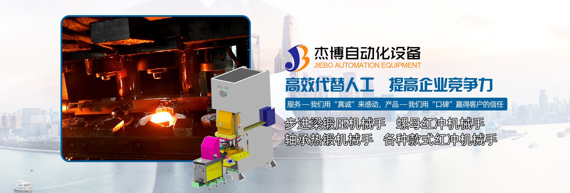 杰博公司專(zhuān)業(yè)從事沖壓、拉伸、紅沖熱鍛及非標(biāo)自動(dòng)化設(shè)備技術(shù)10多年并不斷研發(fā)創(chuàng)新。是一家專(zhuān)業(yè)從事整套自動(dòng)化生產(chǎn)線(xiàn)的研發(fā)、設(shè)計(jì)、制造、銷(xiāo)售、服務(wù)于一體的現(xiàn)代化高新技術(shù)企業(yè)。公司從業(yè)人員有十多年的服務(wù)于沖壓、拉伸、紅沖熱鍛及非標(biāo)自動(dòng)化的行業(yè)經(jīng)驗(yàn),充分了解沖床和模具結(jié)構(gòu)以及沖壓拉伸熱鍛產(chǎn)品工藝,一直致力于推廣和普及沖壓拉伸熱鍛自動(dòng)化,提供安全可靠和成熟穩(wěn)定的沖壓拉伸熱鍛自動(dòng)化設(shè)備,服務(wù)于客戶(hù)降低生產(chǎn)及人力成本,提升生產(chǎn)技術(shù)及產(chǎn)品質(zhì)量,提高沖壓拉伸熱鍛工作的安全性、生產(chǎn)效率和自動(dòng)化,減少人力,改善沖壓工作環(huán)境,提升客戶(hù)企業(yè)總體競(jìng)爭(zhēng)力。